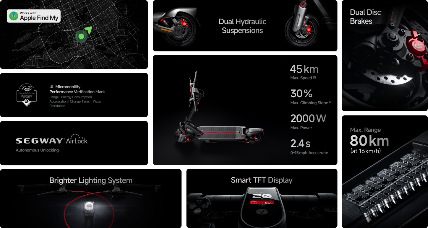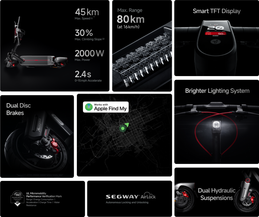 Our signature self-developed SegwayRangeTM technology extends the range, enabling longer rides. With a built-in battery capacity of 597 Wh combined with SegwayRangeTM, the MAX G3 offers a range of up to 80 kilometers.