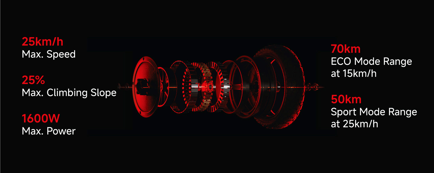 The 1600w high-torque brushless motor empowers seamless rides on flat terrain while effortlessly conquering inclines.